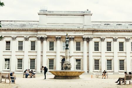London, UK - July 23, 2018: tourists resting on the benches near Old Royal Naval College in Greenwich, London, UK