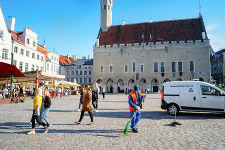 TALLINN, ESTONIA - JULY 14, 2019: Man sweeping central Town Hall Square, walking tourists, old town cityscape in bright sunlight