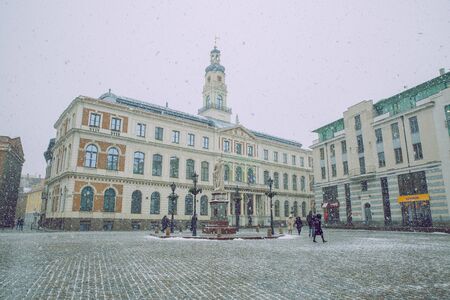 City Riga, Latvia. Old city center. Snowstorm wuth peoples and architecture. Travel photo 2.12.2019.