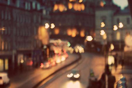 Blurred city at night. Bokeh. Beautiful abstract background with defocused buildings, cars, city lights, people. Colorful bokeh background with urban night scene. Design. Concept backdrop. Vintage
