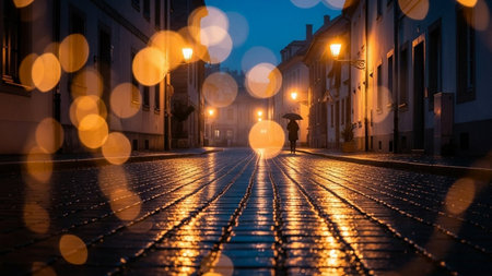 Bokeh lights on a cobblestone street in the evening