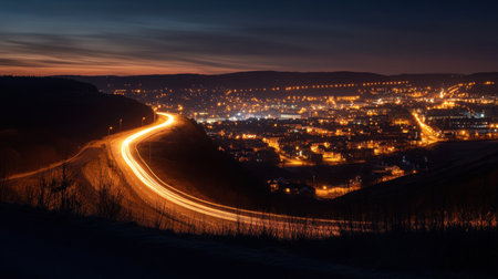 A winding road cuts through hilly terrain, illuminated by the warm glow of city lights below. The landscape is quiet as night falls, creating a serene atmosphere