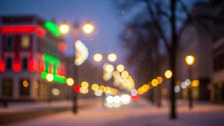 Blurry bokeh lights of red, green, and yellow illuminate a snowy city street at dusk, with soft snowfall and glowing...