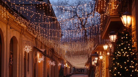 A beautifully lit winter street adorned with twinkling lights creates a cozy and festive atmosphere, perfect for evening strolls and celebrations.