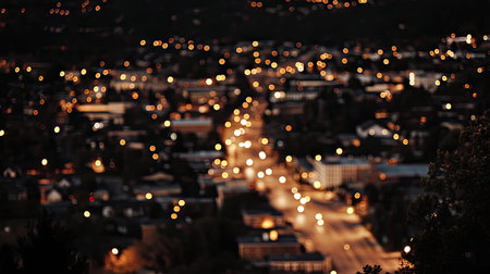 A serene nighttime urban landscape featuring a mesmerizing bokeh effect, highlighting the soft glow of city lights and street illumination, creating a tranquil ambiance.