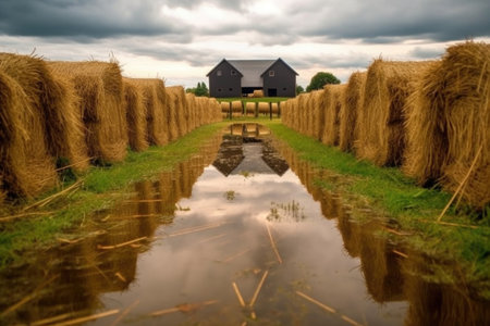 rainy day at a hay bale maze, puddles reflecting the cloudy sky, created with generative ai
