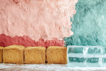 Artistic interior showcasing textured pink and teal walls, with straw bales and ice blocks, providing a vibrant and creative environment for design and inspiration
