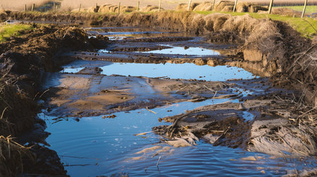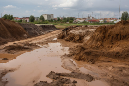 pile of soil and fertilizer runoff, mixing with water and creating toxic sludge, created with generative ai