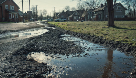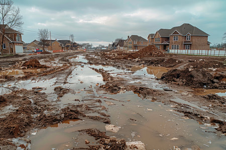 Muddy Street in Front of Houses Under a Cloudy Sky