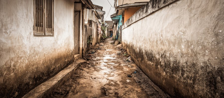 A view down a narrow alley reveals aged buildings with textured walls, creating a sense of history. The alleyway has a damp, muddy surface. Soft lighting suggests an overcast day. This image could be used for various purposes including illustrating stories, backgrounds, and general design.
