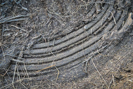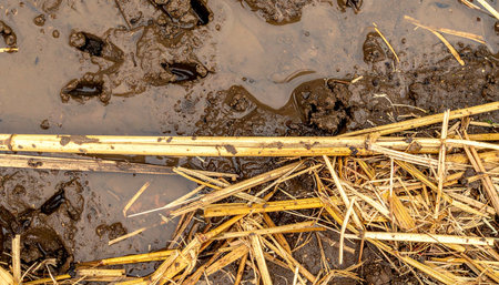 A close-up, top-down view of wet, muddy ground marked with footprints. Scattered straw adds to the rustic, agricultural texture, evoking a sense of rural life, hard work, or the aftermath of a recent rain.