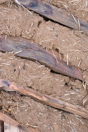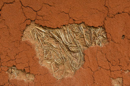 Close-up of a textured adobe wall showing brown mud mixed with straw and embedded red clay bricks.