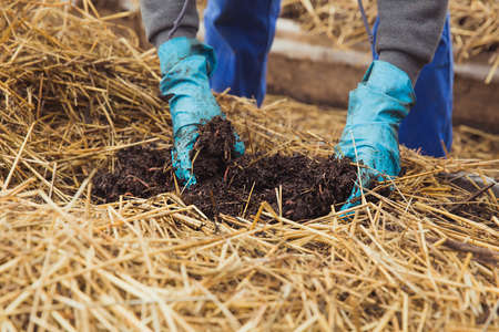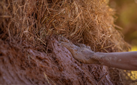 Close-up man's hand making charcoal kiln by use clay mixed with dry rice straw. Building traditional charcoal kiln in Thailand. Thai rural culture. Local life in Thailand. Natural material.