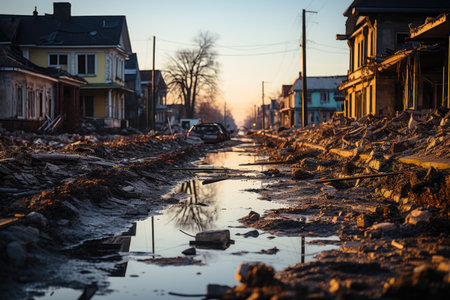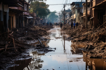 Man cleaning a flooded muddy street in an old urban neighborhood after heavy rain. High quality photo