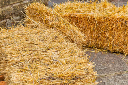 Hay in a bale in a sunny day close-up. Food product for farm animals, farming concept