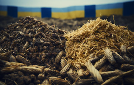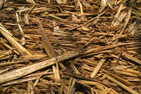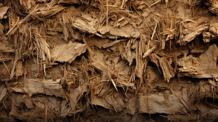 a super wide aerial view photo texture showcasing a vibrant and textured mixed hemp yard mulch. the image captures the thick impasto texture of the industrial materials, giving it a raw and gritty appearance. with elements of trashcore and deforestation, this high-resolution image highlights the history and importance of recycled raw materials. ai generated