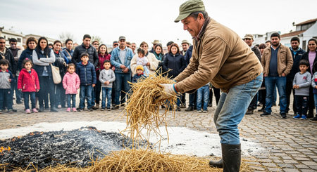 In a rural setting, a farmer prepares the field for planting, watched by a crowd. This scene captures traditional agricultural practices and community involvement.