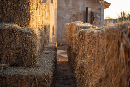 A close-up texture of tightly packed hay bale strands, highlighting the golden hues and rough textures of the straw.