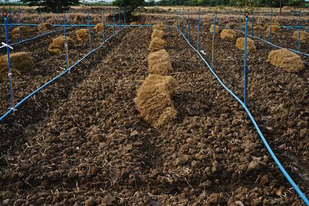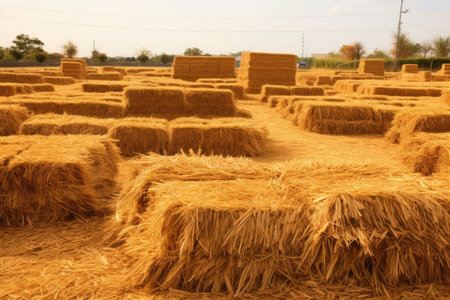 Common sight during Thai rural harvest season piles of pressed rice straw squares near road