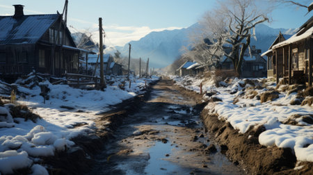 a small village nestled near snow-covered mountains, showcasing traditional street scenes with a touch of aurorapunk aesthetic. the dusty piles add a rustic charm to the picturesque setting, captured beautifully with the carl zeiss distagon t 15mm f/2.8 ze lens. the melting pots and japanese traditional elements create a unique blend of cultures, while the color palette of light indigo and black adds a captivating