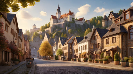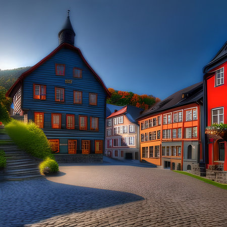 A picturesque scene captures a sunset over a quaint town, featuring cobblestone streets and traditional European architecture. The warm, golden light bathes the buildings and pathways, creating a sense of tranquility. This image, with its inviting atmosphere, could be used for travel, tourism, or editorial purposes.