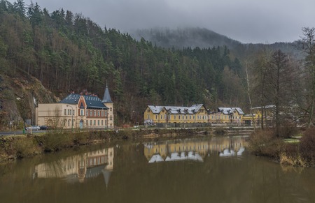 Kyselka spa town with Ohre river in winter morning