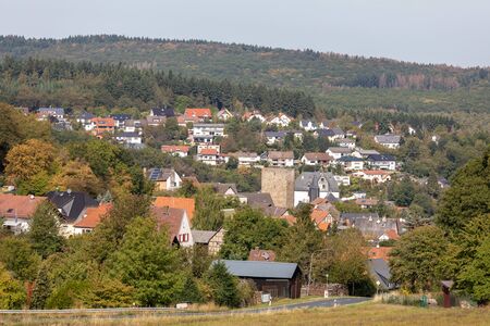 View of buildings and church in Blankenheim fron near hills