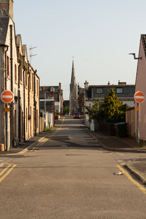 Church of Scotland, Parish Church Invergordon with lots of residential buildings and street in front during sunrise, vertical shot