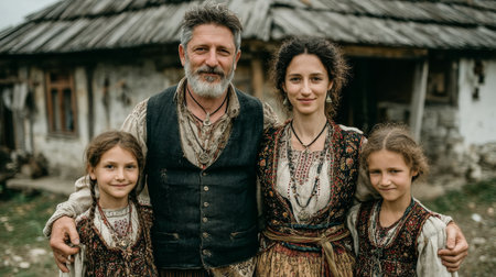 Happy serbian family wearing traditional clothing, smiling outdoors in front of a rustic house