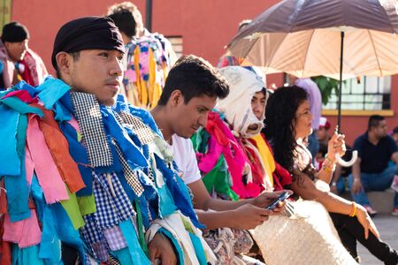 OAXACA, OAXACA, MEXICO- JULY 6, 2019: Young man dressed as tiliche, traditional costume from Putla, Oaxaca, during the Convite, a party made for invite to a big traditional party called Guelaguetza in Oaxaca, Mexico
