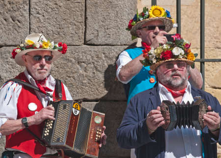 SEGOVIA SPAIN - MARCH 16 2014 - Musicians of the East Suffolk Morris Men in the ancient Roman city of Segovia, Spain with straw hats decorated with flowers. Traditional English folk dancing.