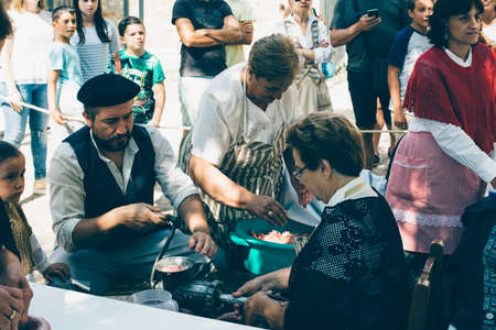 PUERTOMINGALVO, TERUEL, SPAIN - AUGUST 5, 2018: Group of women and men making handcraft sausage during an exhibition in a medieval fair celebrated in Puertomingalvo, a small town located in the Maestrazgo Cultural Park in the region of Gudar Javalambre, i