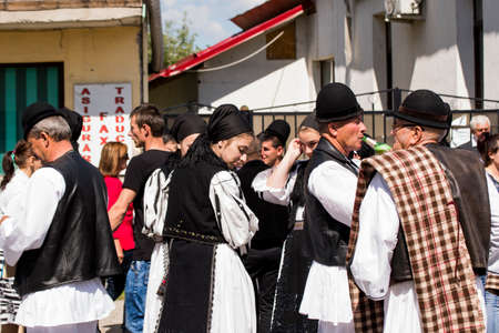 Bucharest, Romania - March 5, 2020: Senior women and men, dressed in Romanian traditional clothing, dance at a festival.