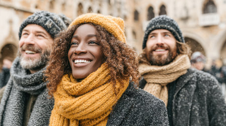 Group of three friends smiling joyfully outdoors on a winter day, surrounded by falling snowflakes and festive atmosphere.