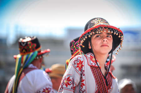 Bucharest, Romania - May 9, 2010: Portrait of a young boy dressed in a traditional costume of the Romanian ancient dancers Calusarii.