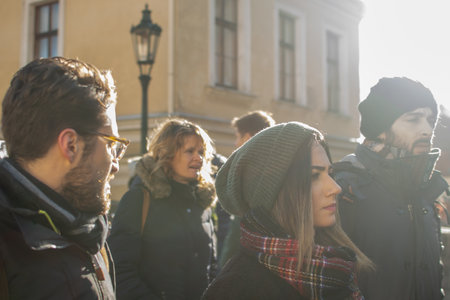 NIZHYN, UKRAINE - OCTOBER 14, 2017: Big crowd warmly dressed walking along the street in autumn, back view