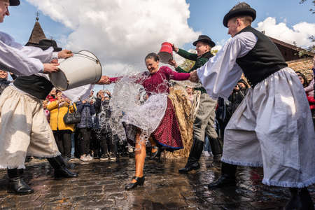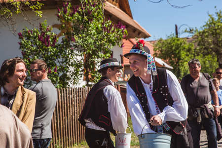 HOLLOKO, HUNGARY - April 12, 2019: Easter festival in the folklore village of Holloko in Hungary. Guys sprinkle water on girls