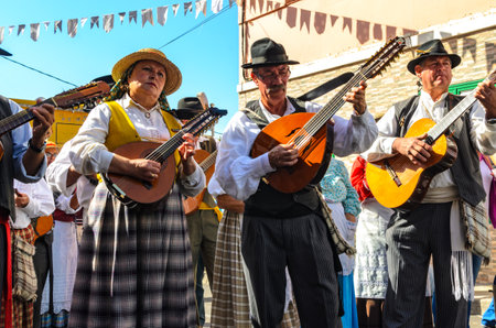 Puerto de la Cruz, Tenerife, Canary Islands - May 30, 2017: Canaries people dressed in traditional clothes walk along the street, sign and play guitars. Local residents of Tenerife celebrate the Day of the Canary Islands.