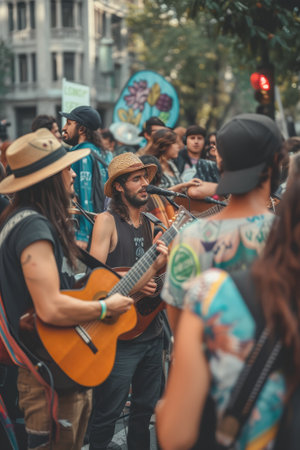 A group of friends creating music at a peaceful protest, their melodies a form of joyful resistance.