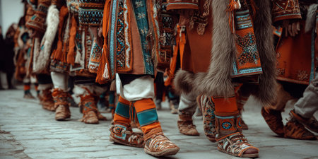Immerse yourself in the vibrant atmosphere of a traditional cultural parade showcasing intricate costumes and unique footwear. This celebration highlights rich heritage and artistry through detailed patterns and vibrant colors.