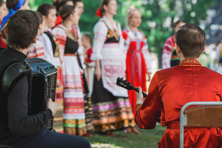 Russian folk traditions. Folk festivals. Children in beautiful Russian traditional outfits sing songs, dance and lead a round dance in Tsaritsyno Park. National Russian clothes. Sundresses and kokoshniks.