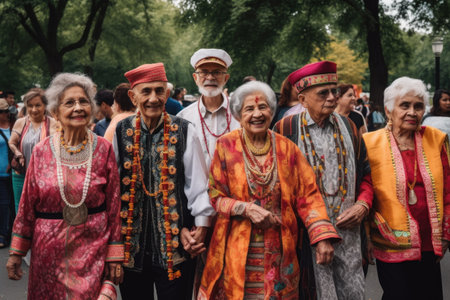 A group of elderly people at a festival of traditional national costumes. The festival serves as a reminder of the importance of preserving cultural heritage.