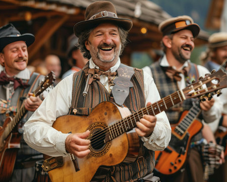 Bavarian folklore band playing traditional music at Oktoberfest, with musicians in lederhosen and hats, creating a lively and authentic vibe