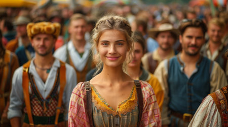 Beautiful young cheerful people wearing national costumes participating in traditional Oktoberfest parade in German town. Generative AI.