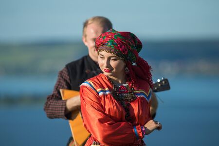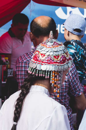 Cheboksary, Chuvashia/ Russia - August 24 2019: A girl in a Chuvash national costume and in a traditional Chuvash headdress of coins and jewelry. celebration of the 550th anniversary of the city of Cheboksary, 550 years