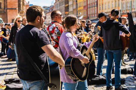 Wroclaw, Poland - May 1 2023: Participants with guitars at open event Guitar Guinness World Record 2023 where record was beaten with 7967 guitars at market square