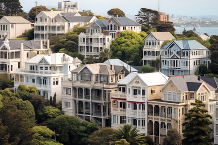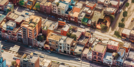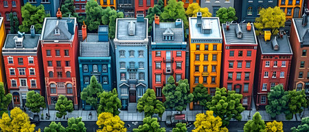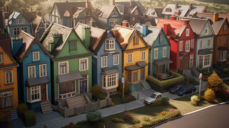 An aerial view captures a vibrant suburban neighborhood on a sunny day. The image showcases a variety of colorful houses with different roof styles, set amidst lush green foliage. Many of the houses have windows that provide glimpses into the homes' interiors, hinting at the families and lives that inhabit this peaceful community.