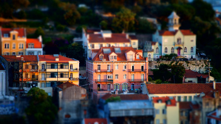 Beautiful colorful sunset landscape aerial view of Lisbon, miniature tilt-shift view, Portugal