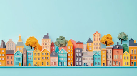 A vibrant collection of crafted houses stands alongside stylized trees, set against a calming blue backdrop. This whimsical cityscape showcases a blend of shapes and colors.