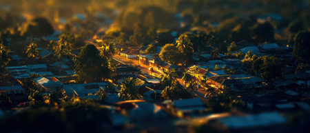 Warm sunlight bathes the village in golden hues during New Year celebrations highlighting the vibrant homes and palm trees.